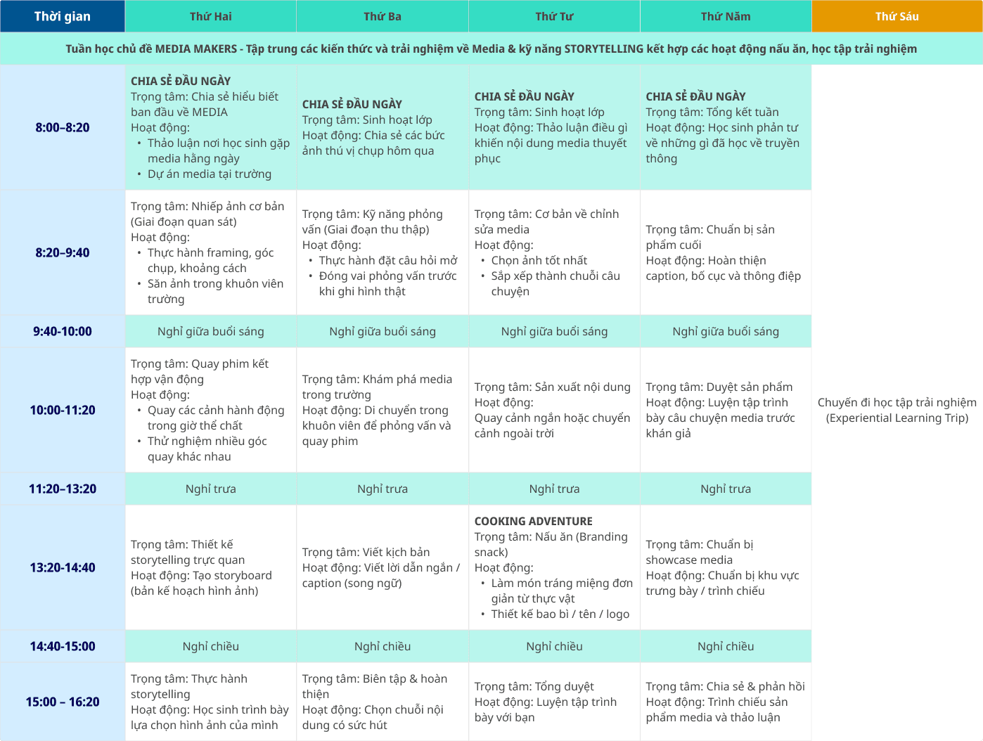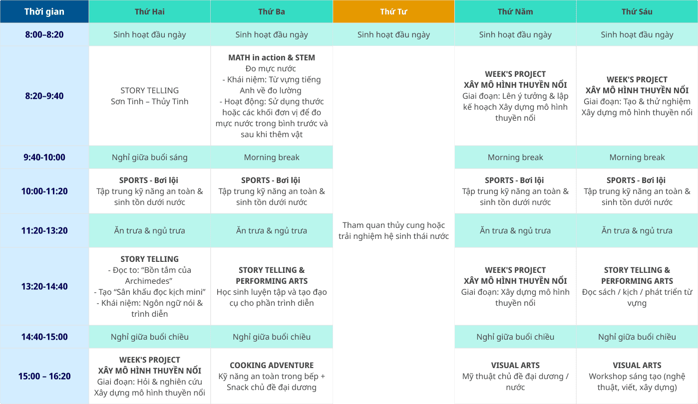 Chương trình diễn ra 5 tuần, từ Thứ Hai đến Thứ Sáu, với thời lượng nửa ngày mỗi buổi, giúp học sinh vừa tăng cường vận động thể chất vừa phát triển kỹ năng thi đấu, tư duy chiến thuật và tinh thần đồng đội.